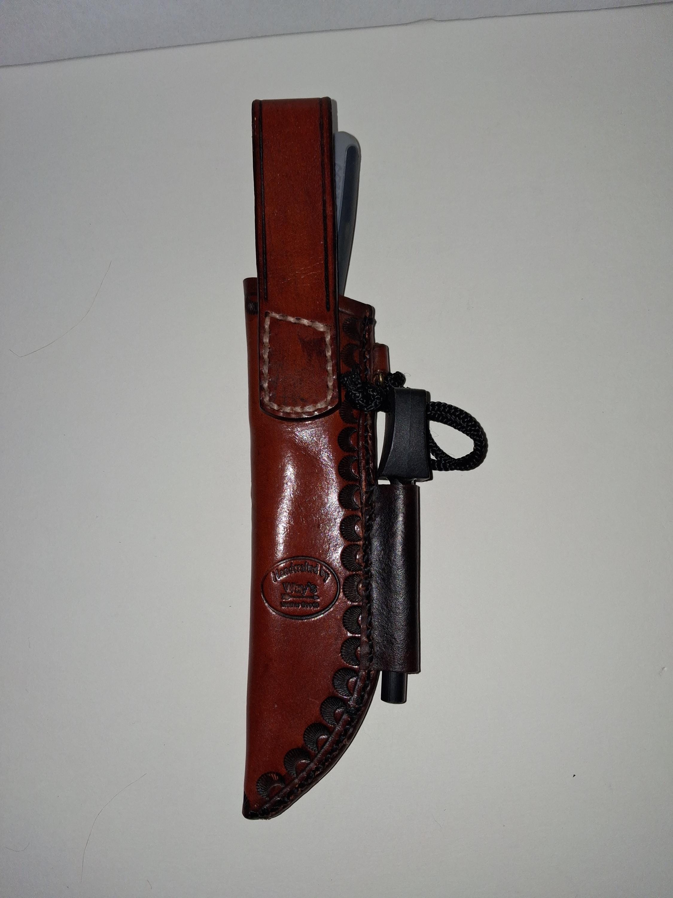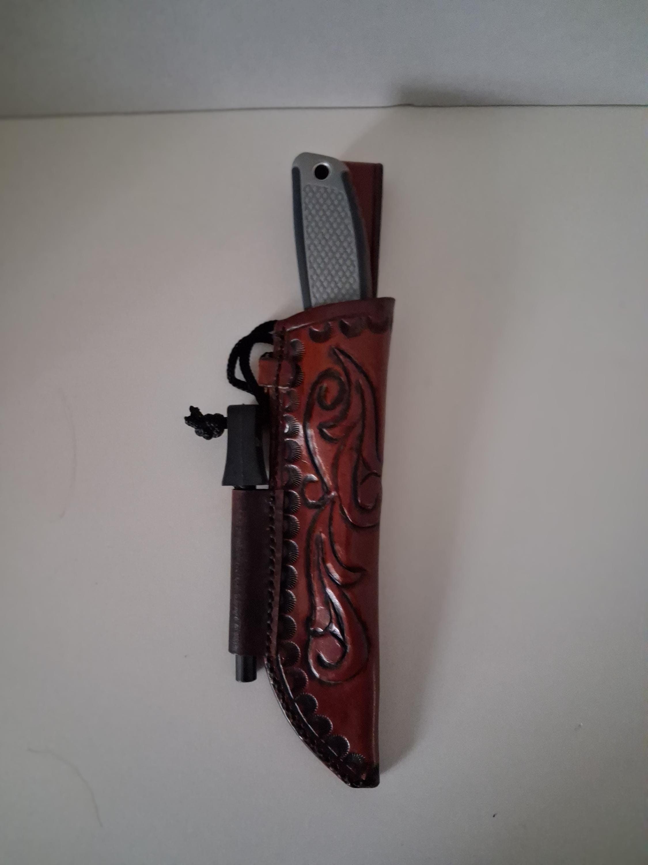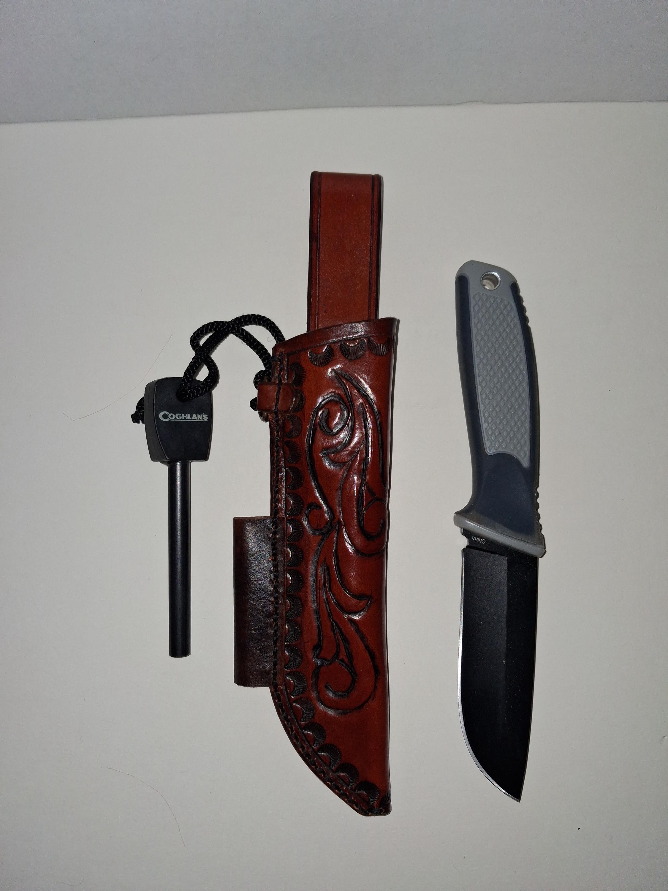 Hand made hand tooled leather knife sheathWith knife and fire starting faro rod.