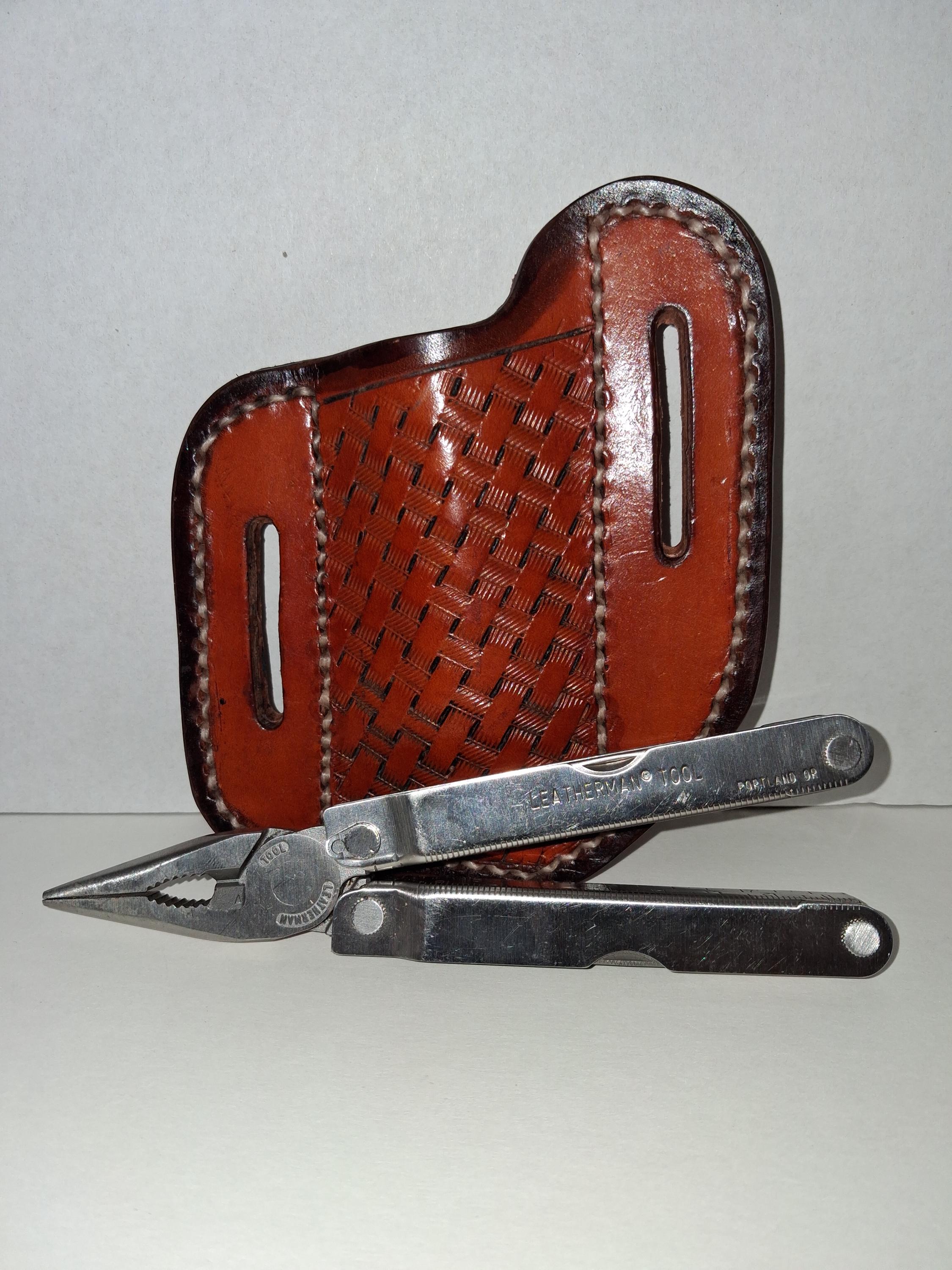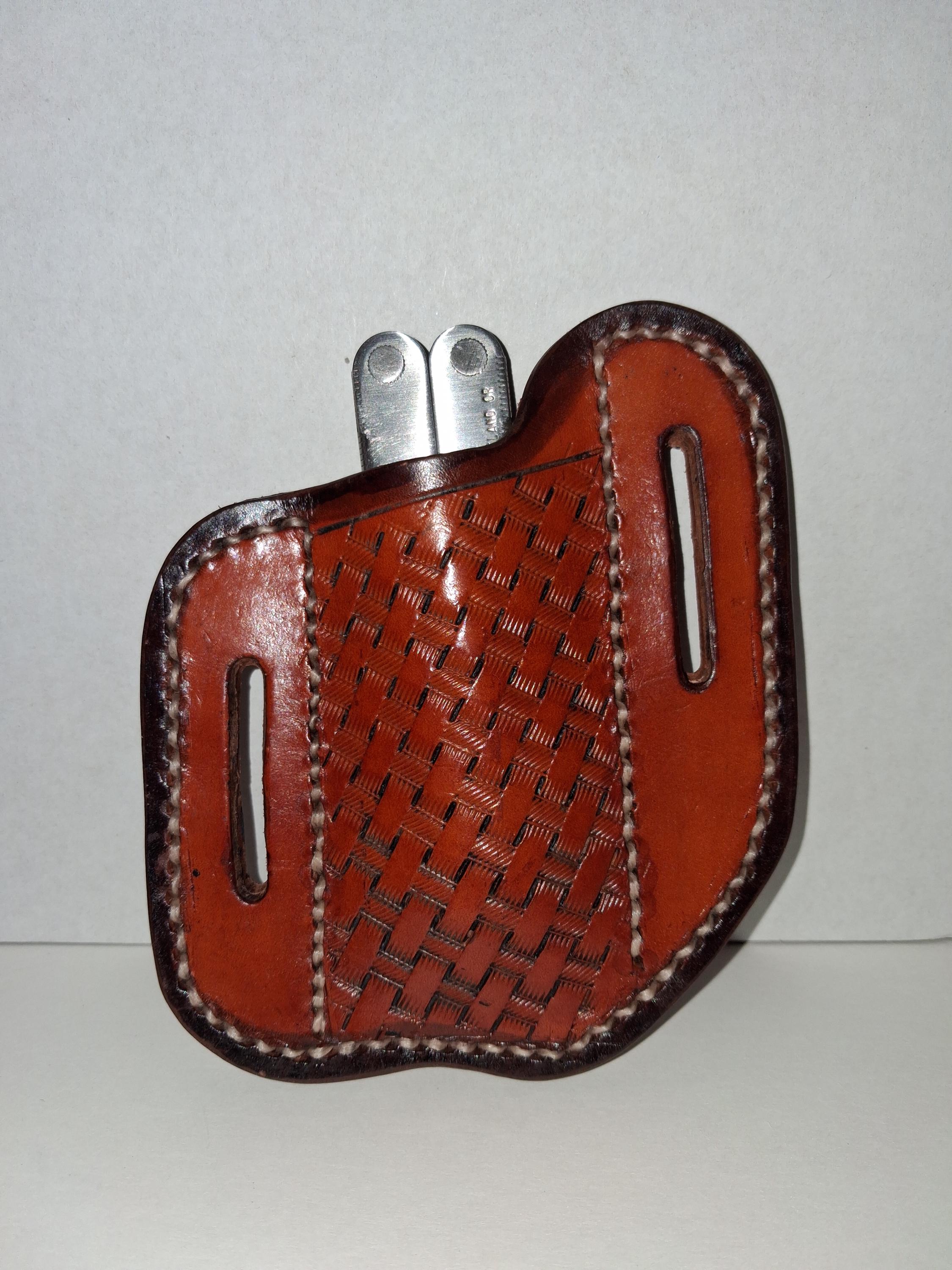Built for durability and everyday use, this handmade leather pancake sheath is designed to securely carry your multitool on your belt. Each piece is hand tooled and hand stitched, showcasing craftsmanship and attention to detail.