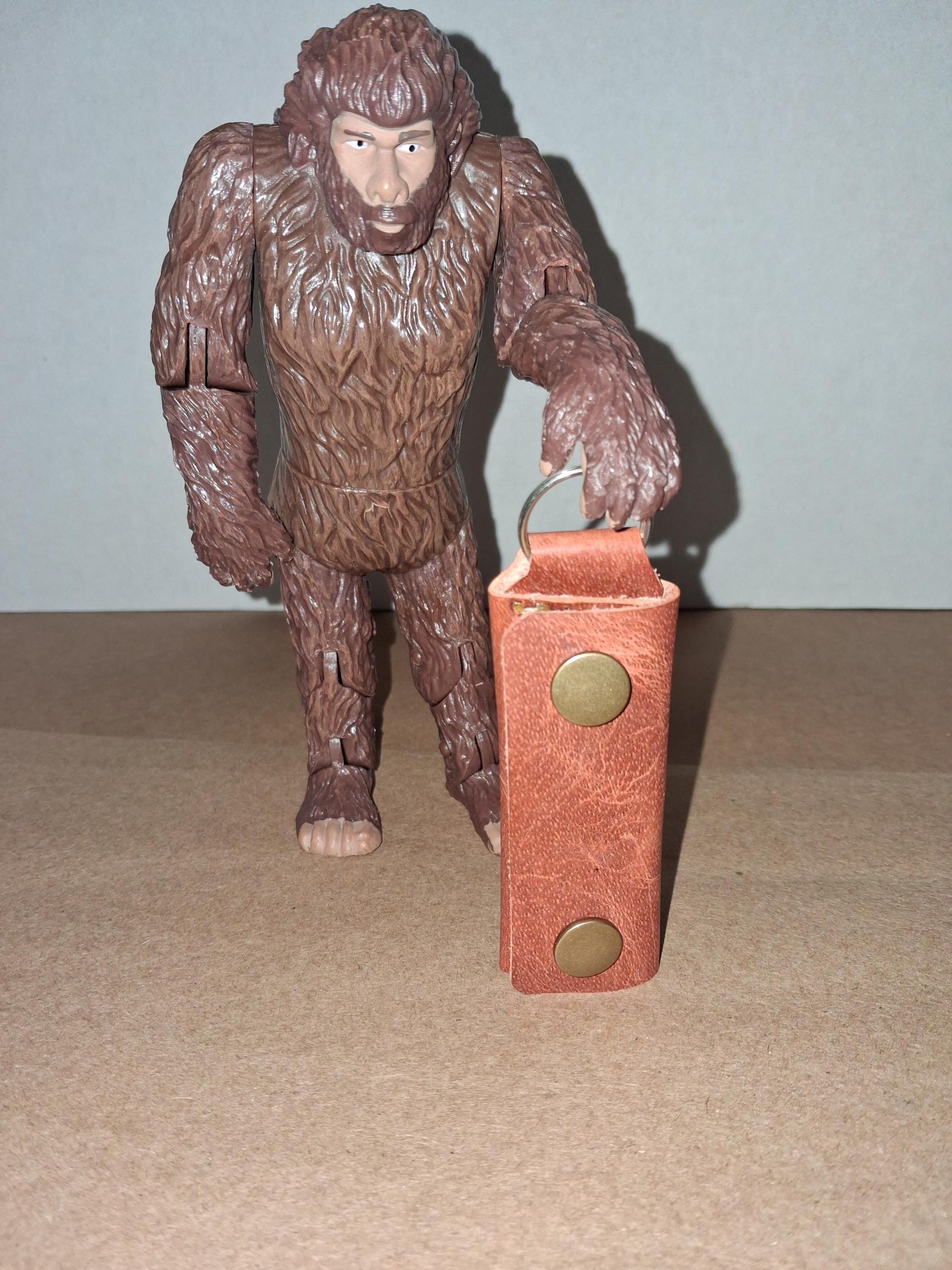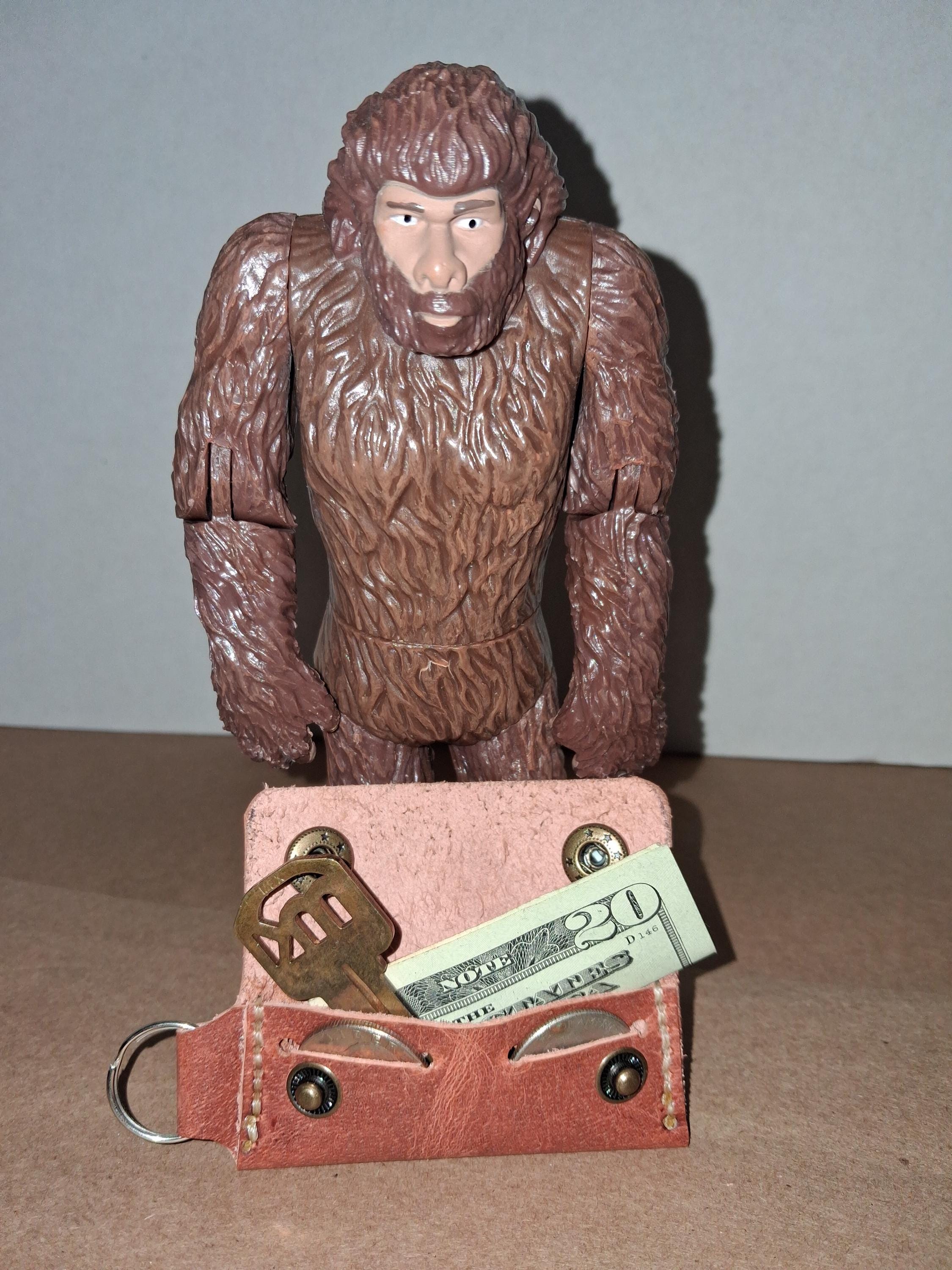 Brown leather.Tan stitching.Holds cash, two coins, and spare house or car key.Two snap closure.
